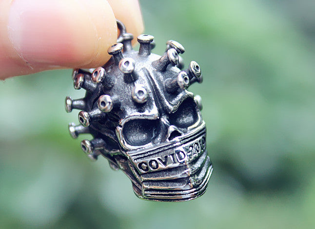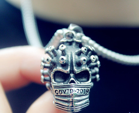 The all Brass pendant necklace of a virus-head skull wearing a golden mask with "COVID-2019" Texts on it.